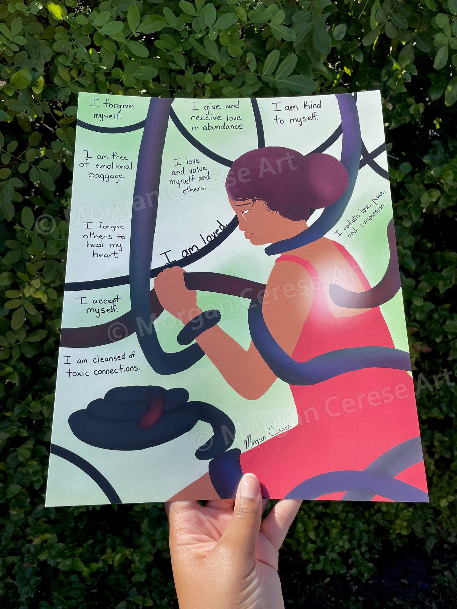 Have you ever dealt with a heartbreak, betrayal, or toxic connection? This artwork depicts a woman removing those connections (the vines) and tossing them aside. However, having to disconnect with someone is a painful experience. It hurts even though it's something that must be done to better yourself and continue to grow. That is why the subject of this piece is crying.