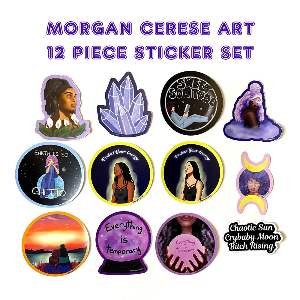 This is a 12 pc set of 3 inch stickers featuring my original artwork and designs. They are waterproof & weather-resistant.