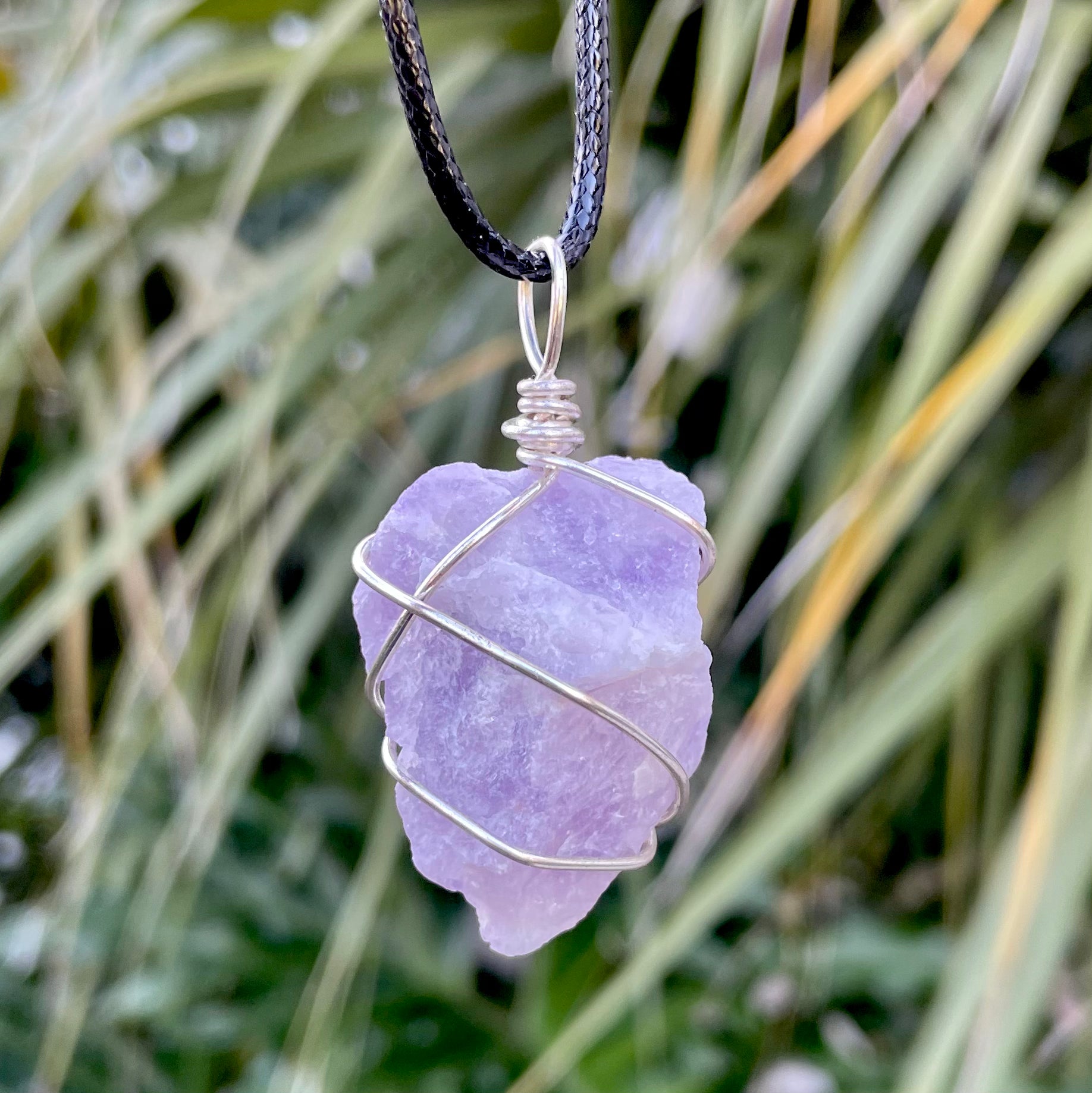 This is a natural amethyst crystal that I wrapped with tarnish resistant silver plated wire. This beautiful pendant is around 2 inches long.