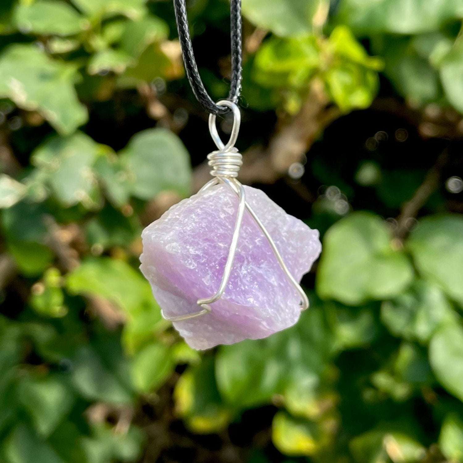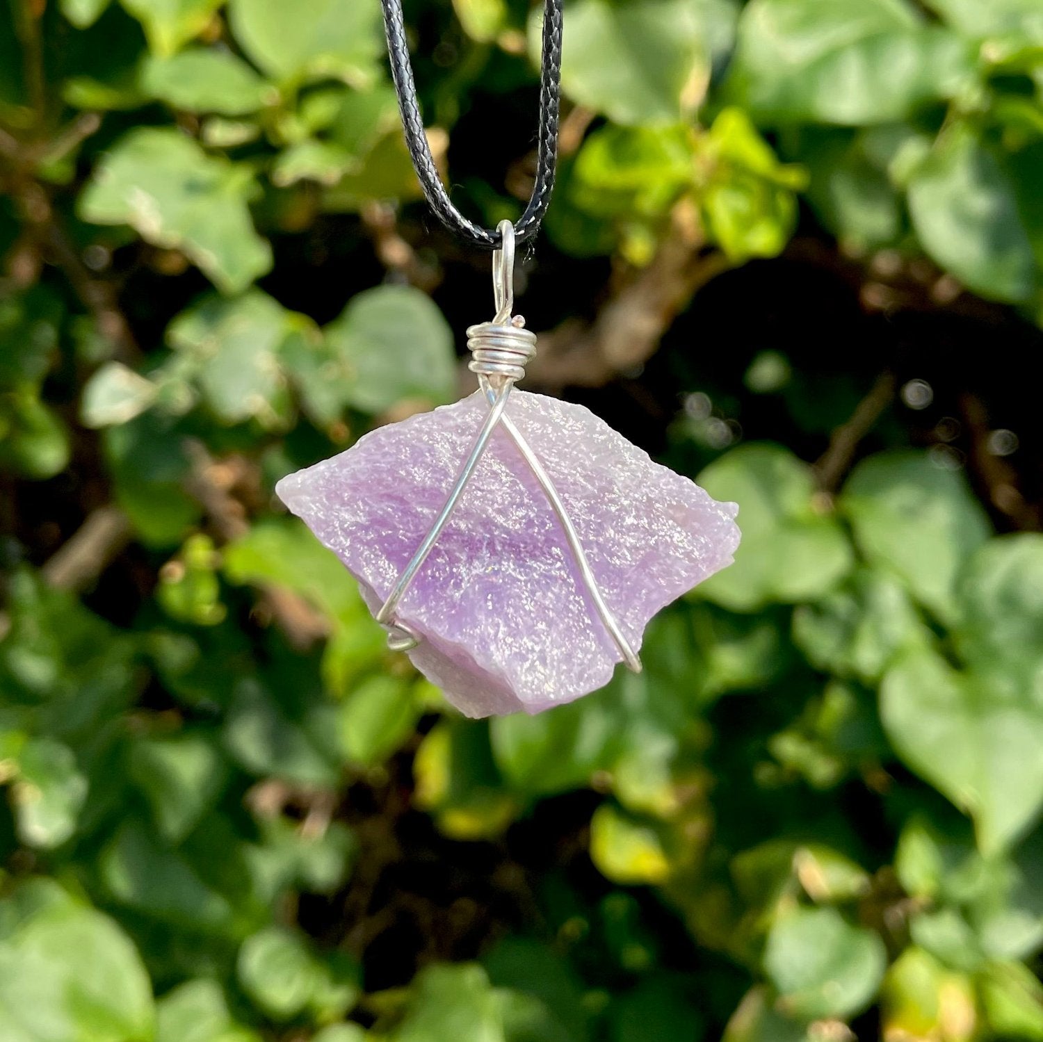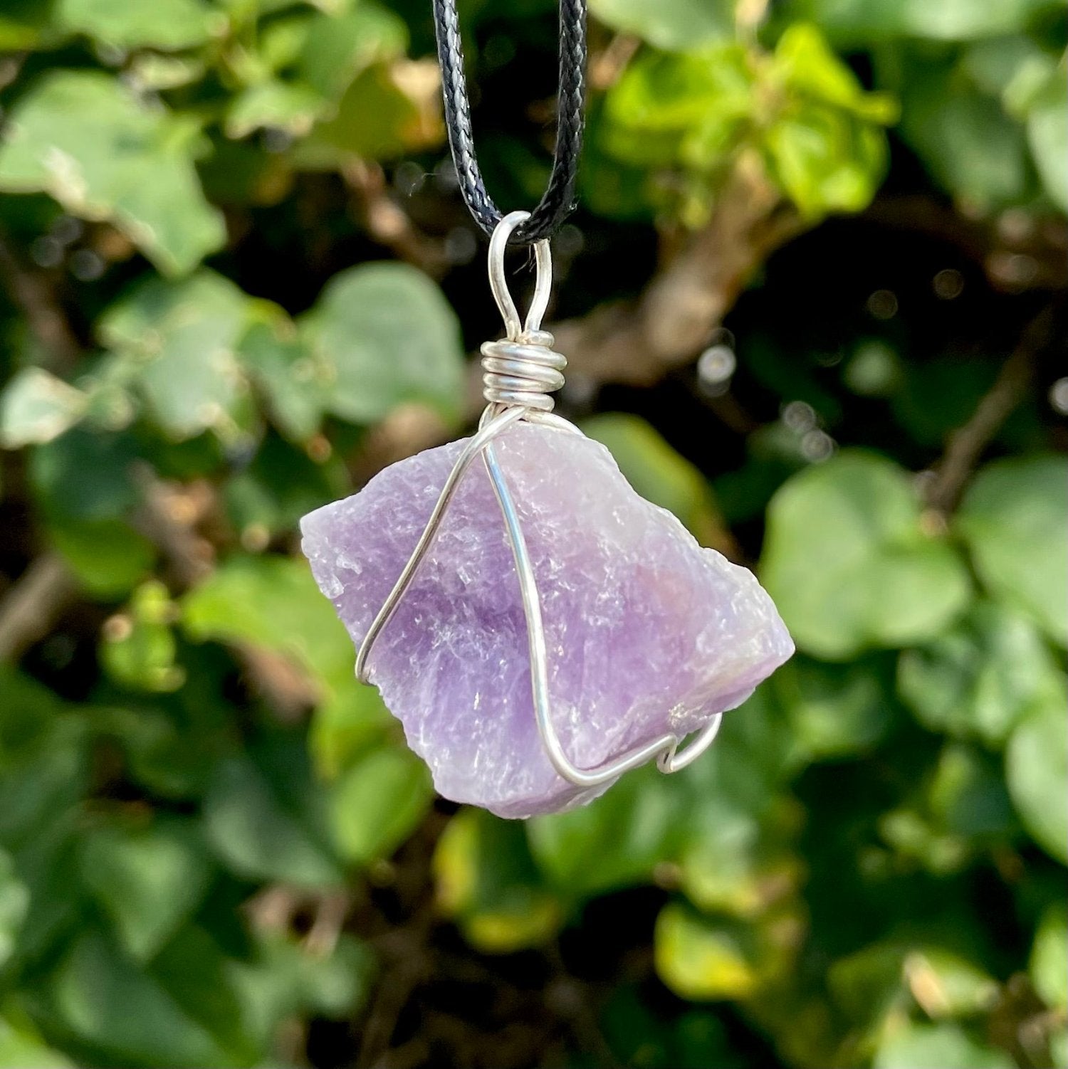 This is a natural amethyst crystal that I wrapped with tarnish resistant silver plated wire. This beautiful pendant is around 1.5 inches long.