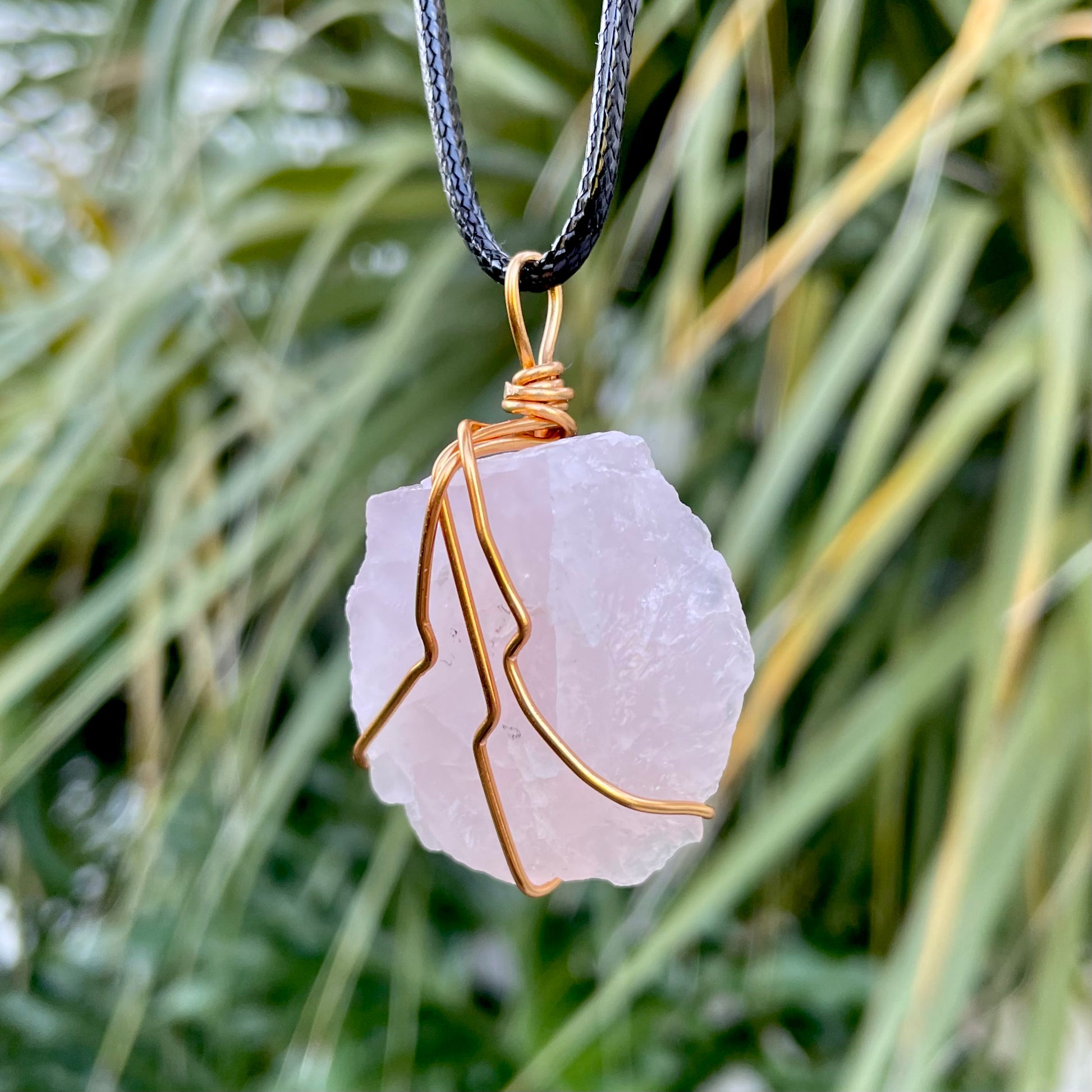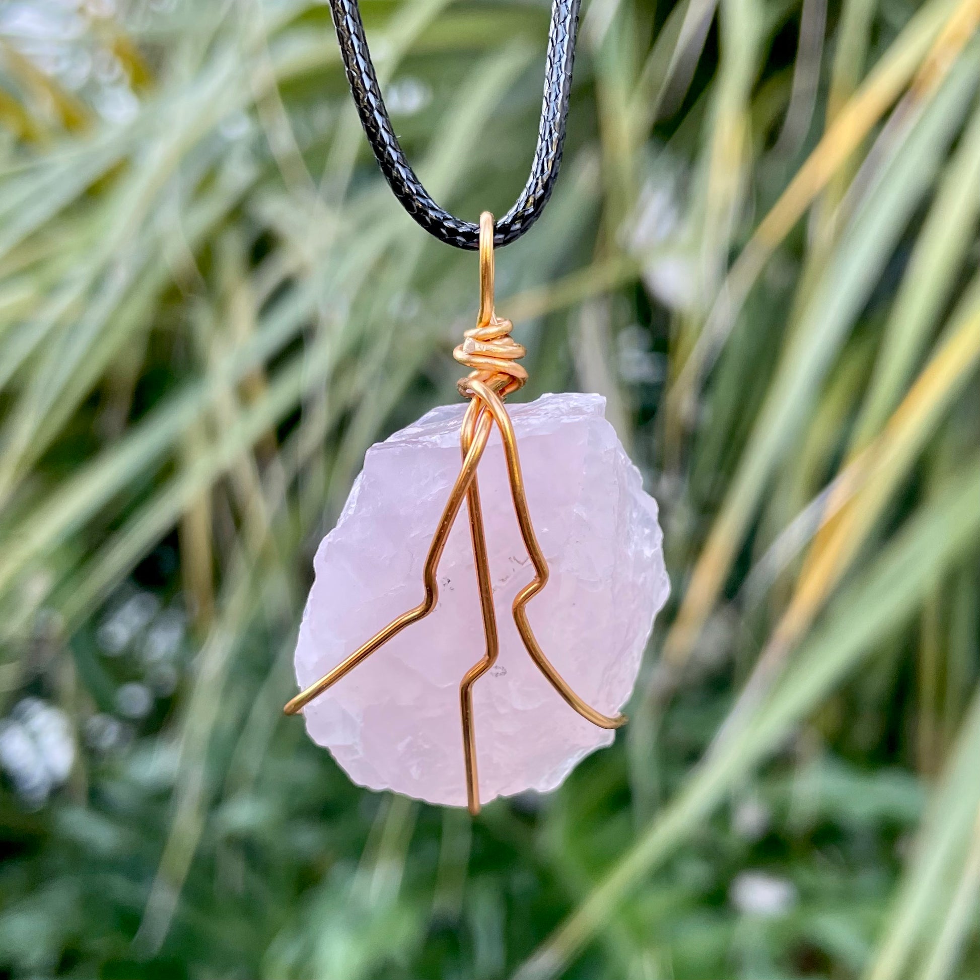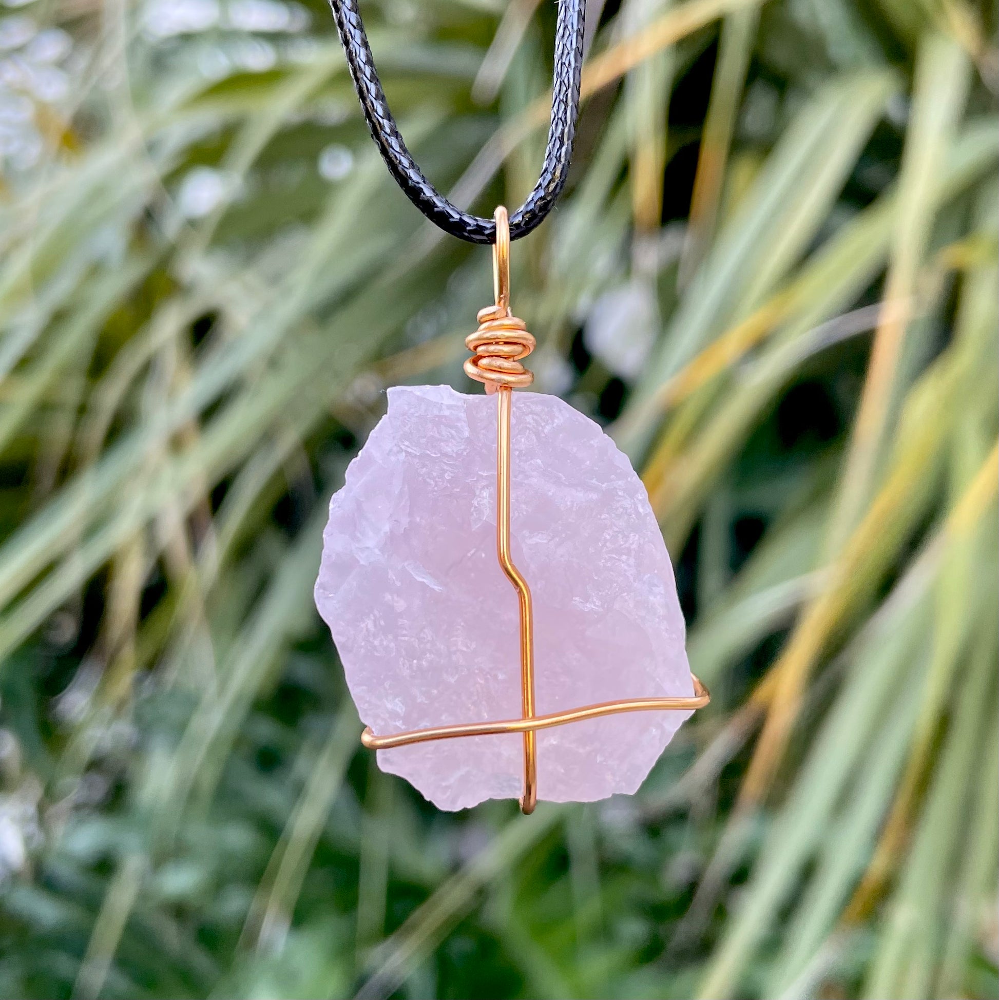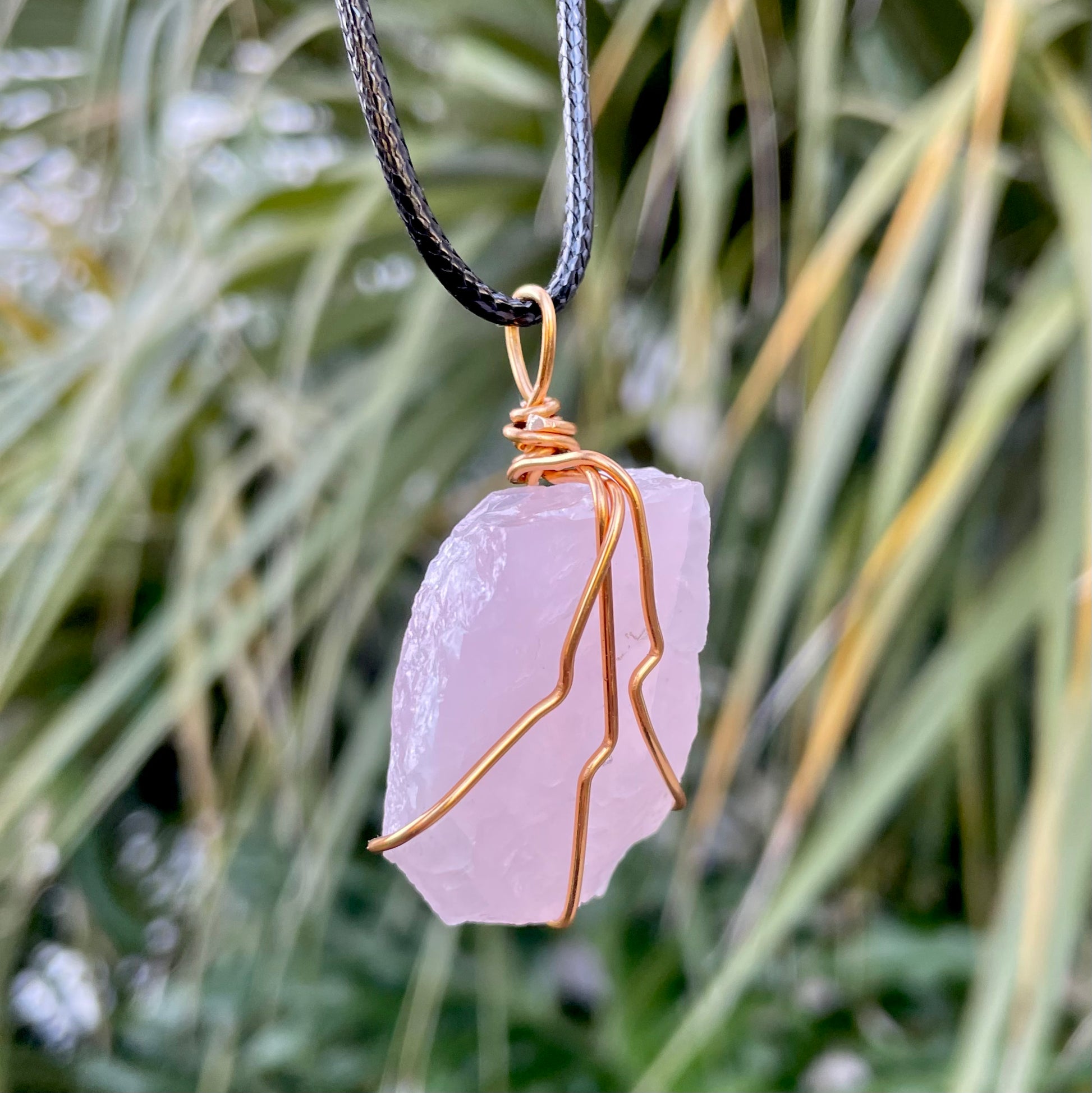 This is a natural rose quartz crystal that I wrapped with tarnish resistant brass wire. This beautiful pendant is around 1.8 inches long.