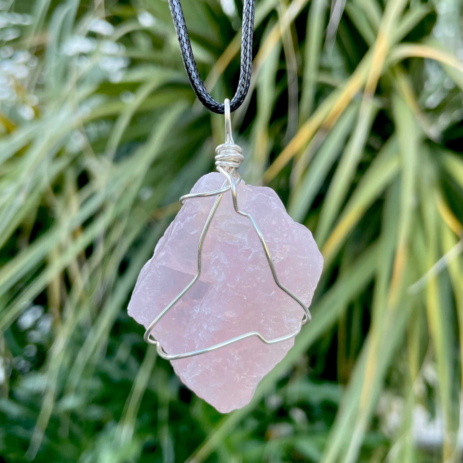 This is a natural rose quartz crystal that I wrapped with tarnish resistant silver plated wire. This beautiful pendant is around 2.4 inches long.