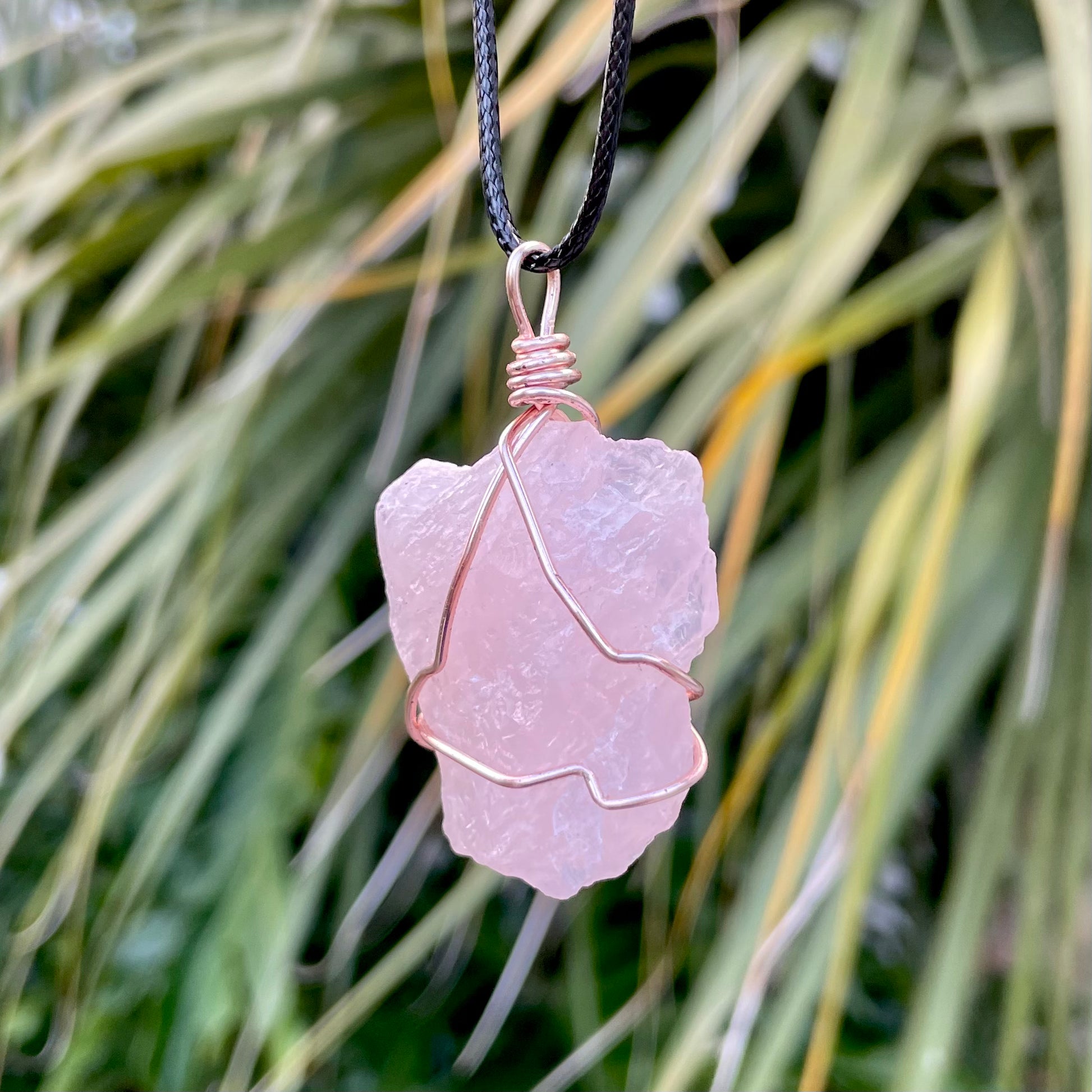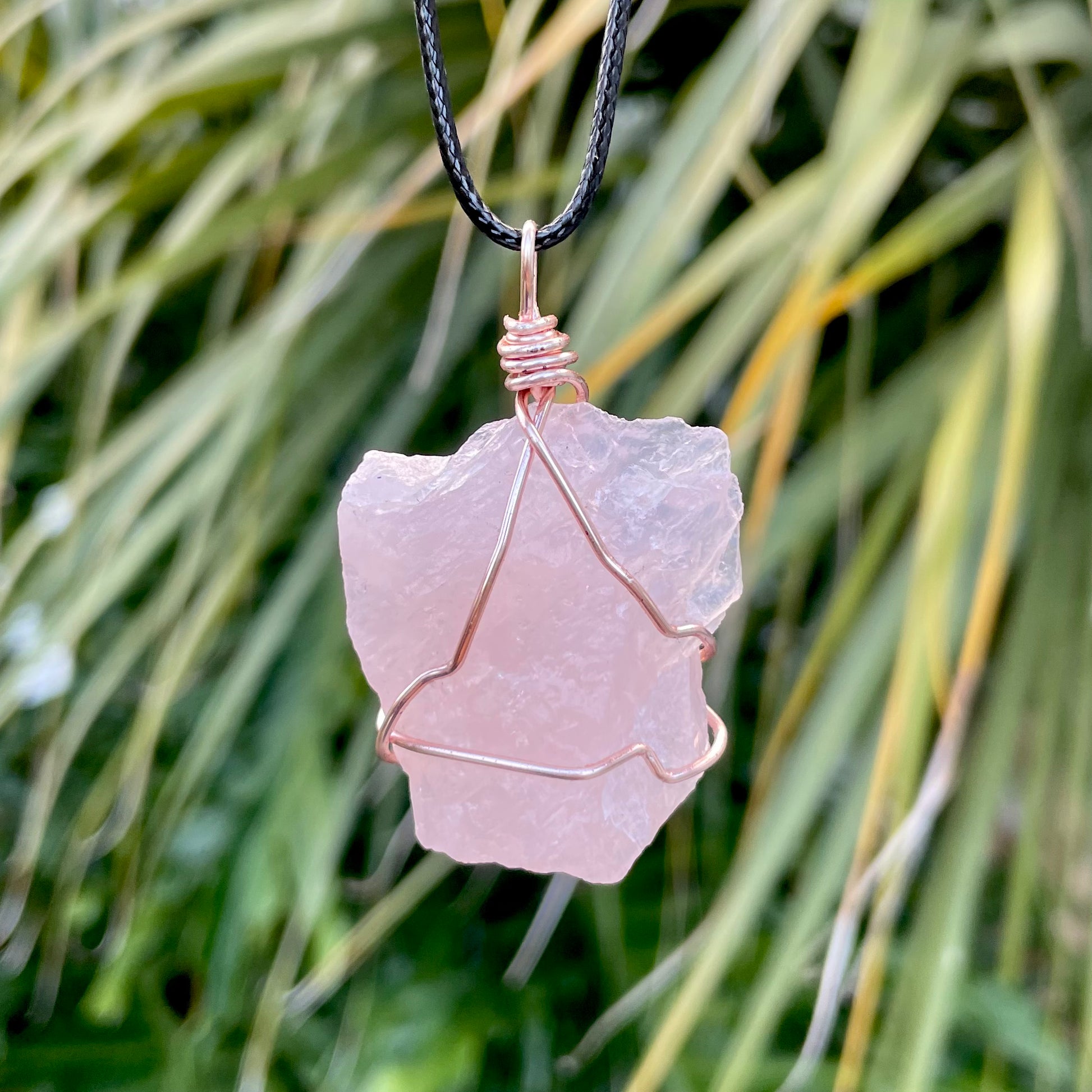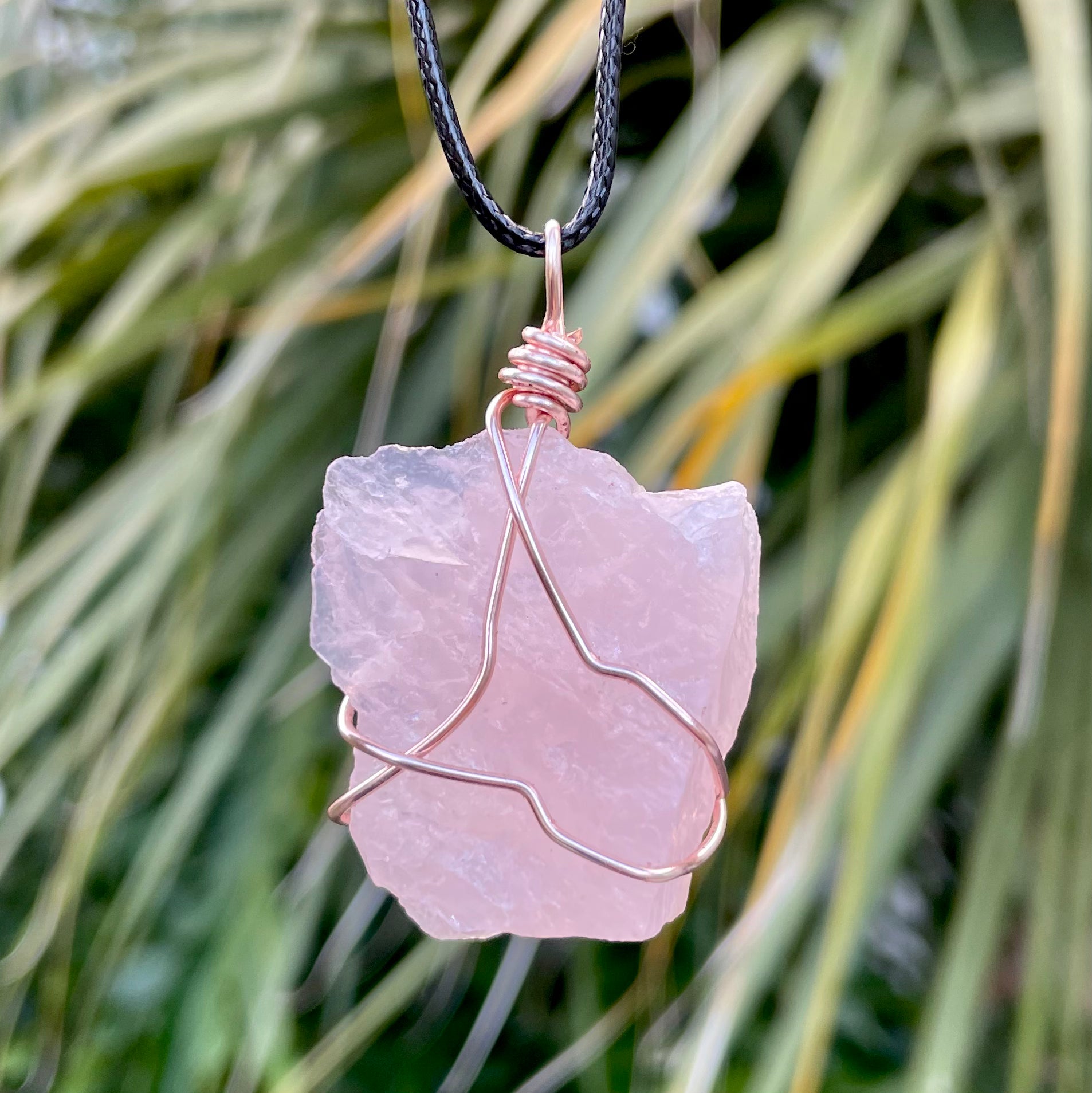 This is a natural rose quartz crystal that I wrapped with rose gold colored silver plated wire. This beautiful pendant is around 2 inches long.